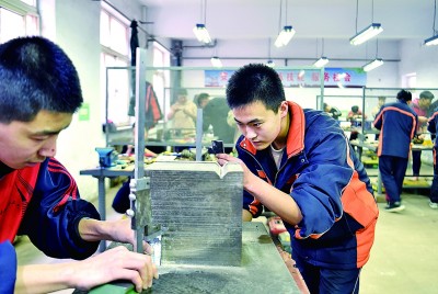 2月15日,在河北省石家庄市井陉县一所职业技术教育中心,学生在进行技术训练。张晓峰摄/光明图片