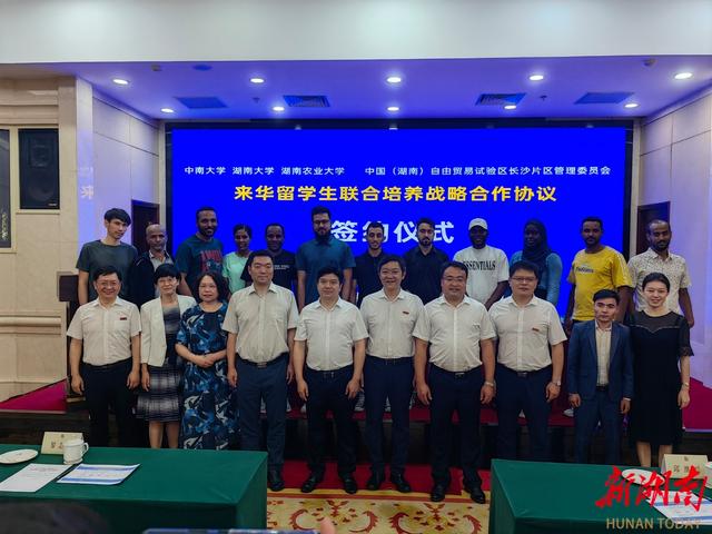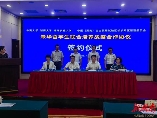 6月27日下午,中国(湖南)自由贸易试验区长沙片区管理委员会、中南大学、湖南大学、湖南农业大学来华留学生联合培养战略合作协议签约仪式在湘麓山庄举行。