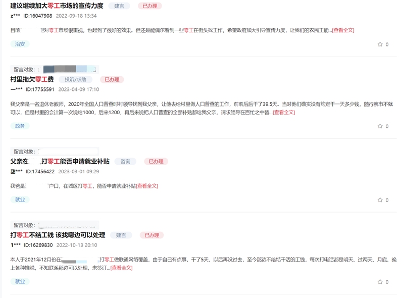 人民网“领导留言板”上关于“打零工”的各类求助、建言。人民网“领导留言板”截图